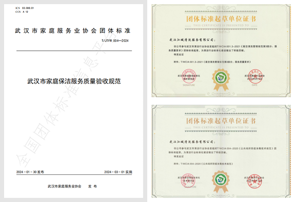 主導(dǎo)起草3項(xiàng)行業(yè)標(biāo)準(zhǔn):《高空清洗管理規(guī)范》《公共場(chǎng)所防疫技術(shù)規(guī)范》《武漢市家庭保潔服務(wù)質(zhì)量驗(yàn)收規(guī)范》